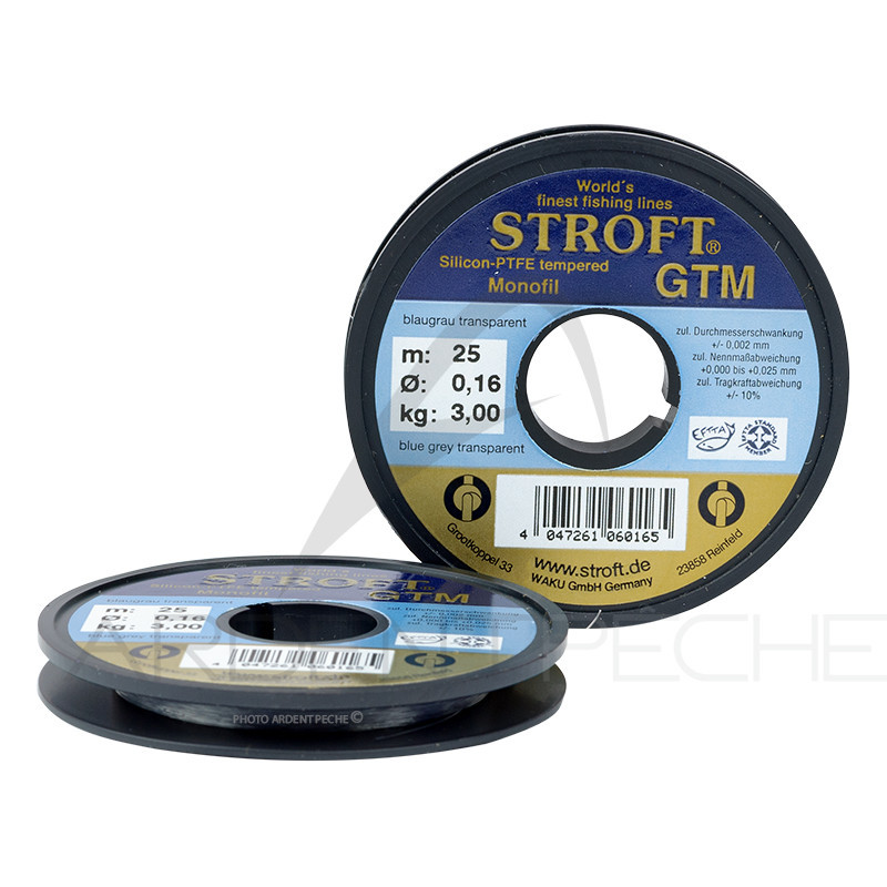 | 24703-009 | Diamètre : 0,25 mm Add to my wishlist "Fils nylon STROFT GTM (25m)" Select a wishlist to add this product There are not wishlist. This product has been added to wishlist. View my Wishlists This product has been added to your wish list. Remove This product was successfully removed from your wish lists. | 25 m | 6.4 kg | 2 en stock €7.90 |