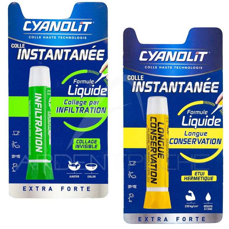 Colle extra forte pour tout coller. La Cyanolit verte à une prise instantanée , la Cyanolit jaune à une prise retardée denviron 20 secondes.