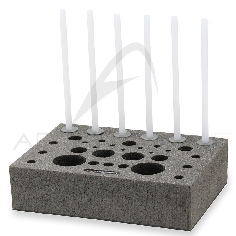 Un superbe porte outils de montage de mouches en mousse découpée avec précision, comprenant 6 broches pour les fils de montage et des trous de différentes dimensions pour différents outils : ciseaux, bobines, colles, etc. etc.