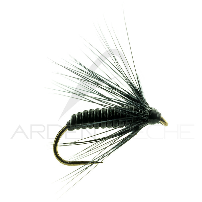 Mouche noyée à collerette en plume de coq et corps noir.Ce modèle destiné à pêcher sous la surface peut être utilisé seul ou sur un train de mouches pour prospecter les courants.