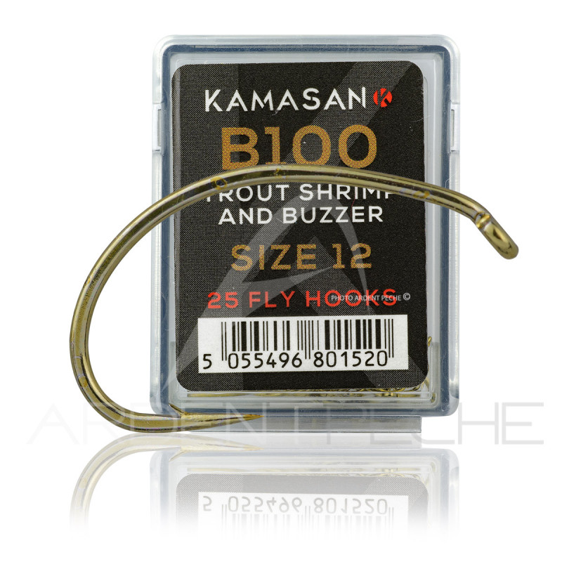 Le Kamasan B100 est un hameçon en bronze à œillet vers le bas, courbure arrondie de type caddis, destiné aux mouches sèches, émergentes, pupes ou nymphes pour la pêche de la truite en eau douce.