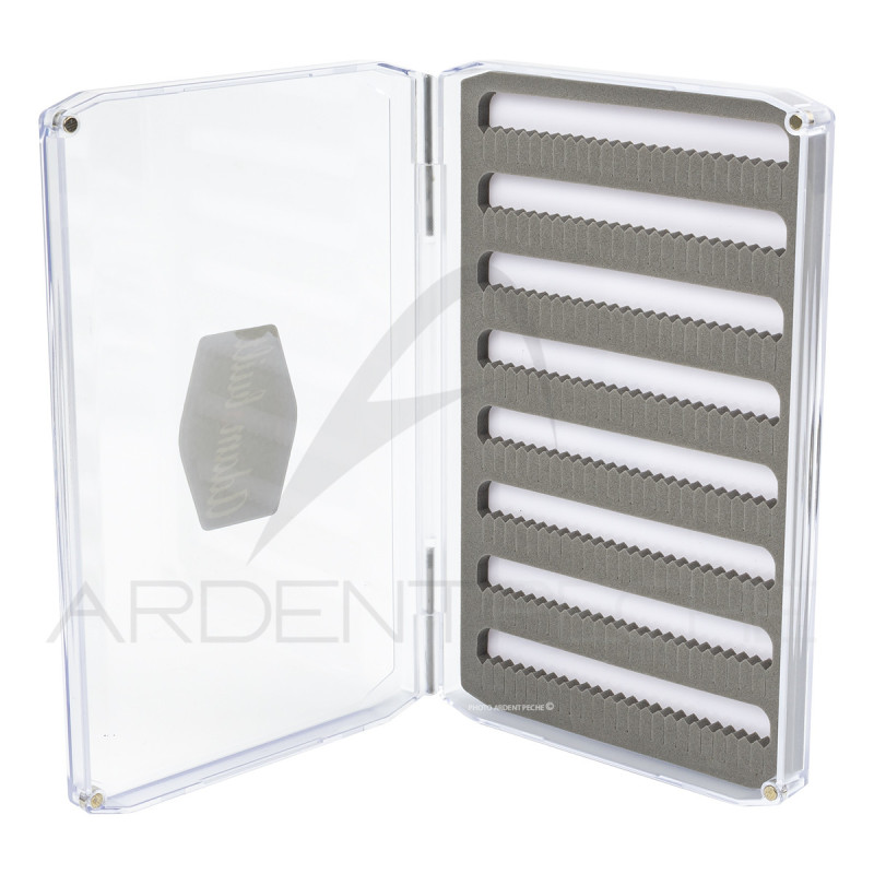 Boîte à mouches légère, conçue pour le rangement de mouches sèches, nymphes fines ou émergentes. Elle est équipée d’une mousse à fente (« Dry Fly Foam ») qui permet de maintenir les hameçons en place sans abîmer les collerettes ou ailes délicates.